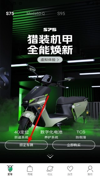 进入车型展示页面后,能查看包括【S75】在内的车型信息,找到【绑定车辆】按钮,点击此按钮即可进入车辆绑定方式的选择界面。