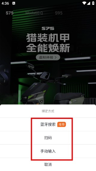 点击【绑定车辆】按钮后,会弹出绑定方式的选择菜单,其中包含【蓝牙搜索】、【扫码】和【手动输入】三种选项,您可以根据自身需求选择对应的绑定方式。
