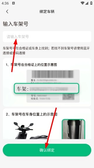 在选择【手动输入】的绑定方式后,进入对应页面填写【车架号】,可参照示意图找到车架号,之后点击【确认绑定】按钮即可完成操作。
