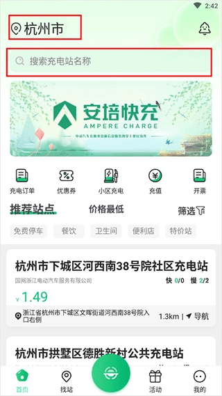 打开安培快充应用后,可选择定位查找附近的充电站,也能直接输入充电站名称进行快速搜索。