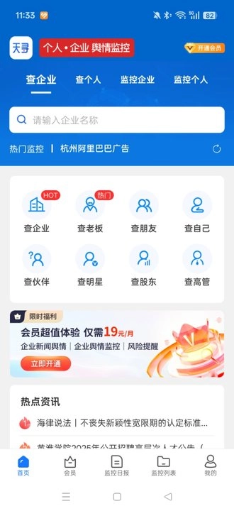 进入首页后,能看到这里集中呈现了众多功能,我们可以从中选择查企业、查老板、查朋友、查自己等舆情监测的常用功能,点击任一栏目即可进入。