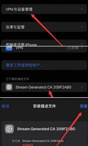 依次在手机上完成以下操作:先安装CA证书,接着打开设置,找到“VPN与设备管理”选项,然后点击刚才的文件进行安装。