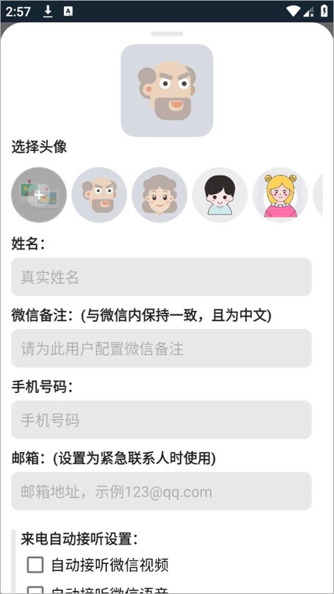 用户打开应用后,可在联系人管理界面添加需通话的微信联系人,并为每个联系人设置通话方式与自动接听选项。