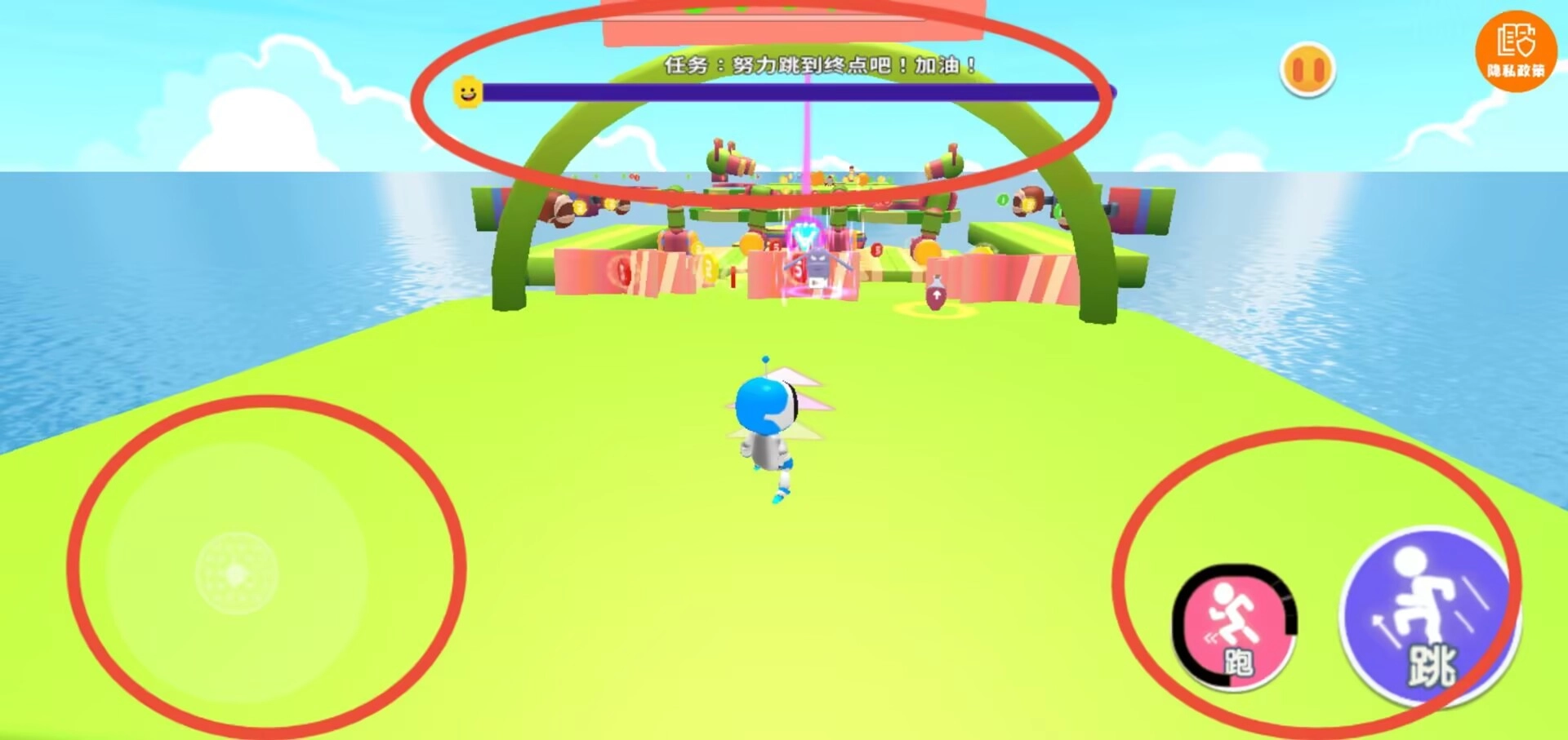 3、界面顶部会实时刷新当前关卡的目标及完成进度,左下角用于操控角色的移动方向,右下角的按钮则承担着跳跃与加速的功能。