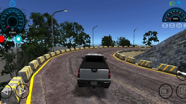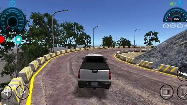 2、在行驶过程中,依据道路弯道处类似黄色警示标线的标识,通过方向键来调整车辆转向,避免碰撞到护栏,顺着道路持续前行,同时要留意观察速度表。