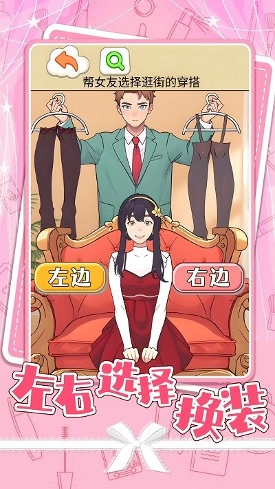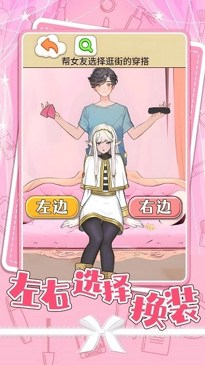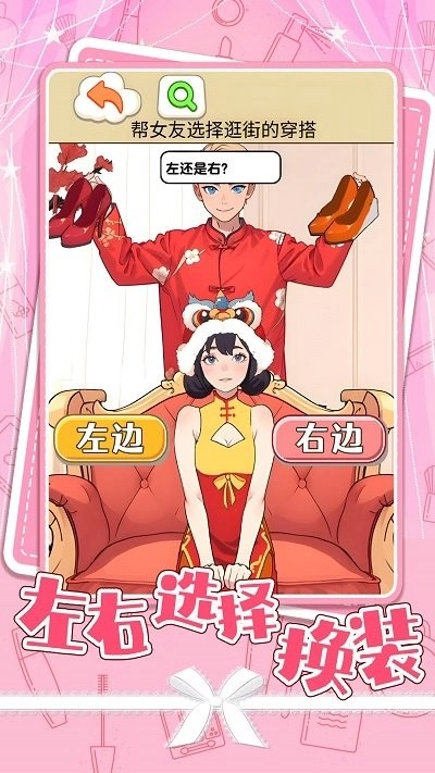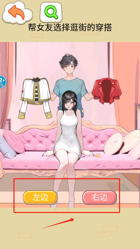 3、通过点击左边或右边的按钮,来为女孩挑选逛街所穿的衣服,挑选时需依据男生手中举着的衣服款式进行选择。