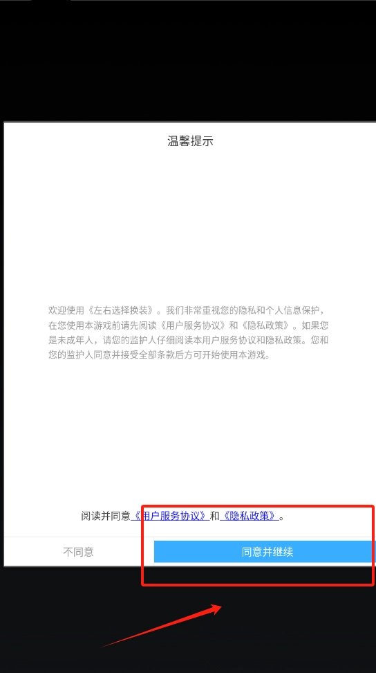 1. 点击“同意并继续”按钮跳过协议,即可进入游戏主界面,界面底部设有“不同意”按钮与蓝色的“确认”按钮。