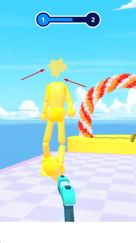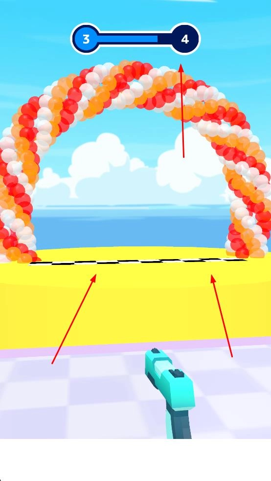 3、指引射击后的小人穿过气球拱门,最终抵达带有黑白格标识的终点区域,以完成关卡任务。