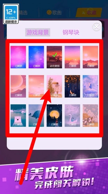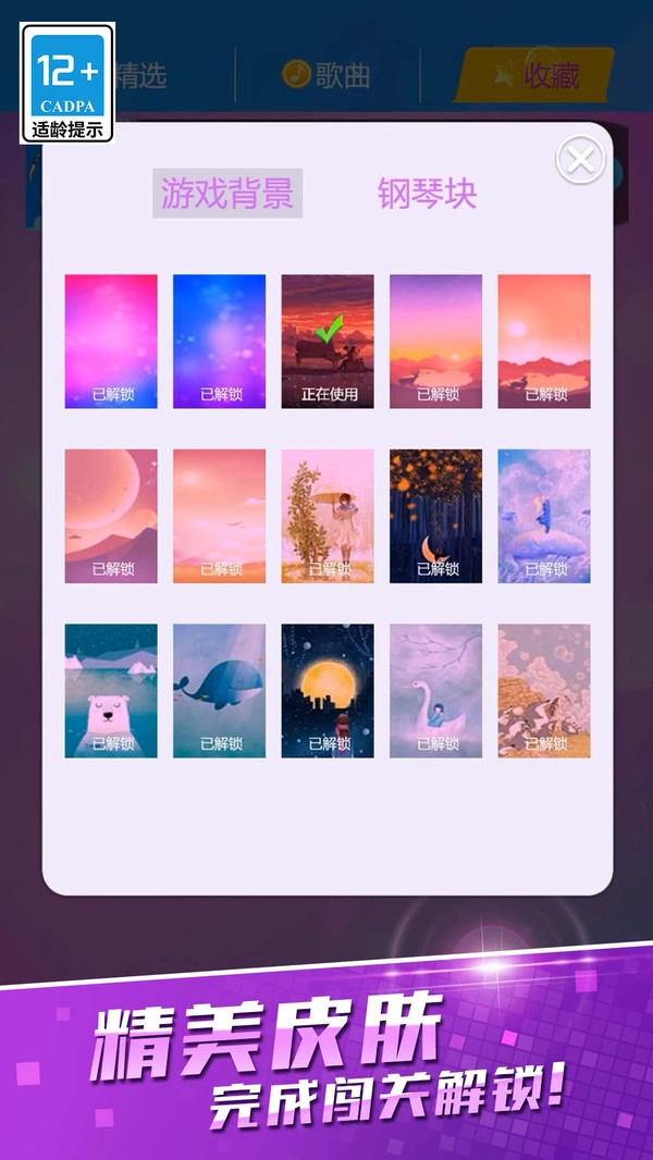 1. 玩家能够通过闯关解锁精美的皮肤,借此更换背景与钢琴块,从而使游戏的视觉体验更为丰富。