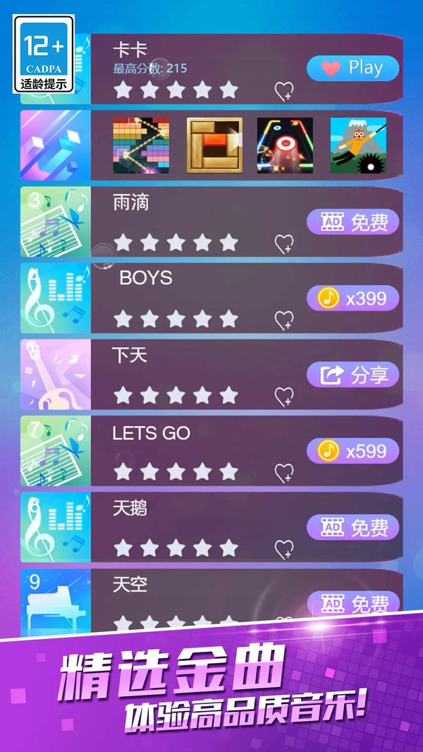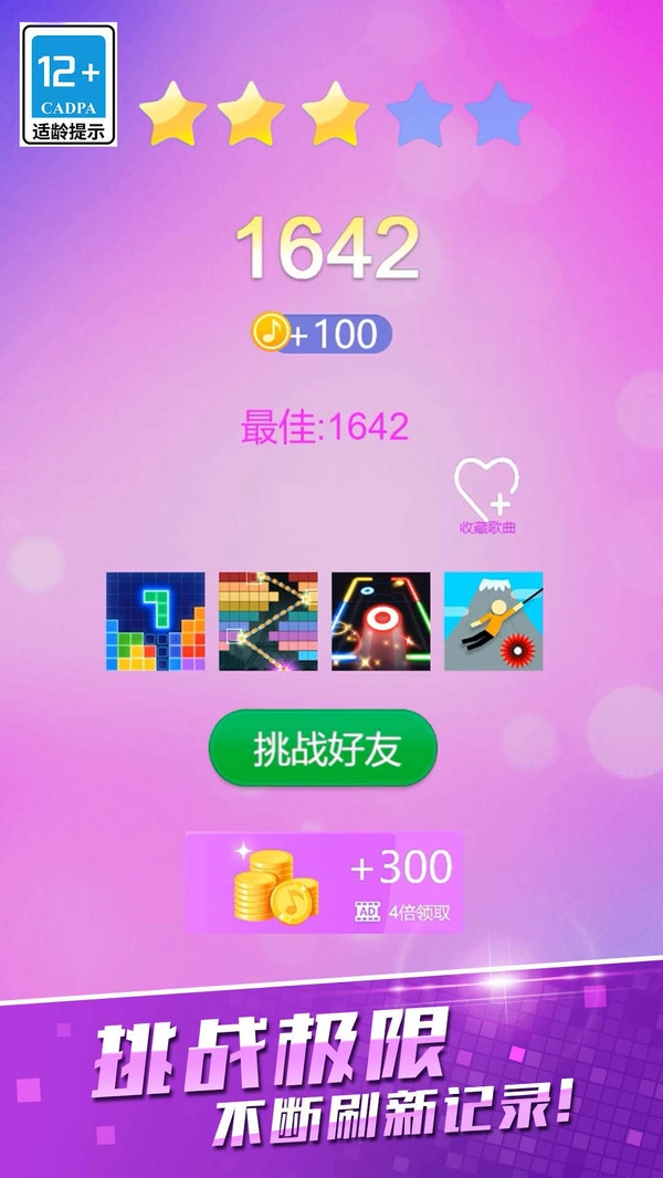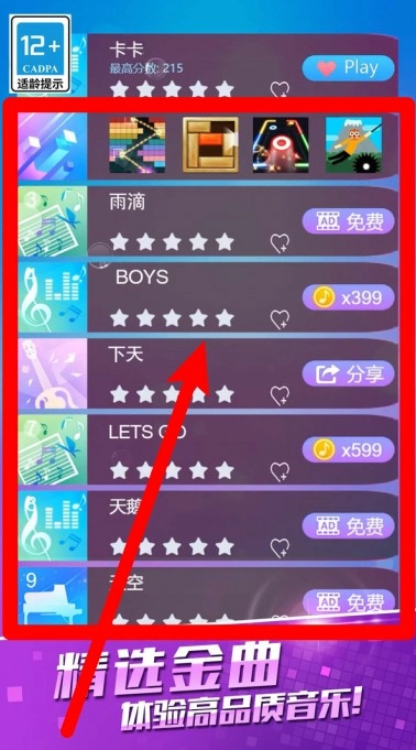 2. 从每一首精选金曲里挑选出自己最钟爱的音乐,伴随着旋律点击方块,向高分纪录发起挑战。