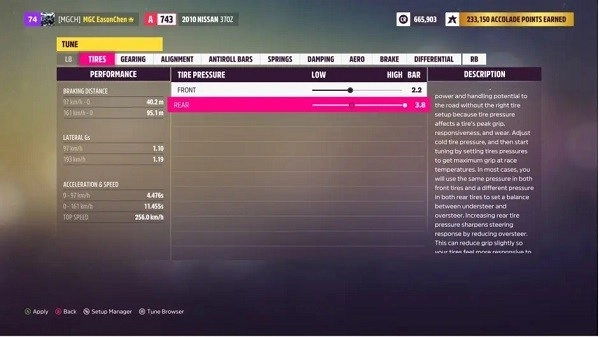 最后一步,仅需把车辆后轮的胎压提升到最大值,如此一来,一台基础的漂移车便大功告成了!
