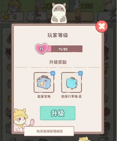 当经验值积攒足够后,点击左上角的爱心就能实现升级!伴随着等级的逐步提升,能量宝箱、行李箱等珍贵稀有的道具都在等待你来获取。
