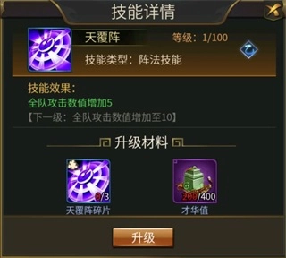 4、技能升级时,需要耗费相应的阵法碎片与才华值,技能等级越高,所需的材料数量就越多。举个例子,天覆阵技能从0级提升到1级,要消耗2个天覆阵碎片以及200点才华值;而从1级提升到2级,就需要3个碎片和400点才华值。