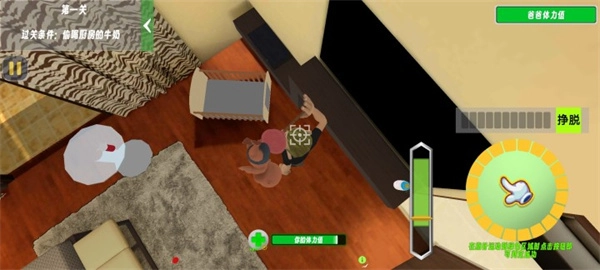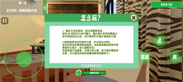 3、被爸爸抓住时扣除体力值,出现逃脱成功判定则体力按一定程度反弹并减少疲劳进度,进入正常状态;若逃脱失败则减少进度条,同时减少体力值,体力值归零游戏失败,可以通过喝牛奶来恢复体力。