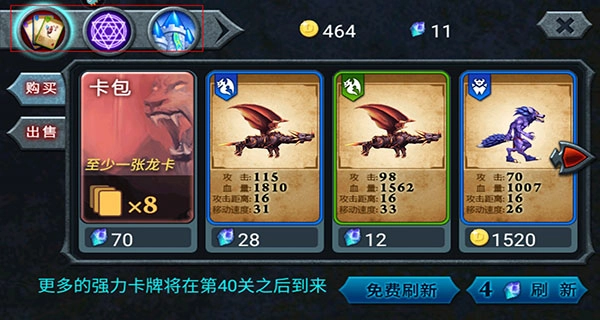 3、玩家需先购买卡片,再进行合成,以此提升攻击力。合成后的卡片放置于下方卡槽,随后点击右下角的红色按钮,即可开启游戏。