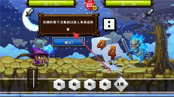 3、在战斗界面中,通过投掷骰子的点数与敌人(骷髅战士)展开对战。当显示“投掷的骰子点数超过敌人”时,即可造成伤害,以此推进回合制战斗,充分体现游戏的核心玩法。