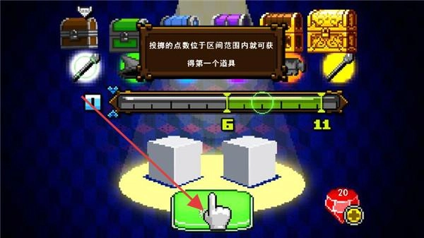 2、在道具获取界面,玩家通过投掷点数来获取道具,界面上会展示宝箱、武器等物品。点击绿色按钮即可进行投掷操作,此过程既考验运气,也考验策略。