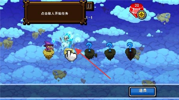 1在关卡选择界面中,会呈现“点击敌人开始任务”的提示。界面内设有角色(魔法师)、敌人岛屿,玩家能够通过选择关卡来推进冒险进程。此外,在界面的右上角还设有道具入口。