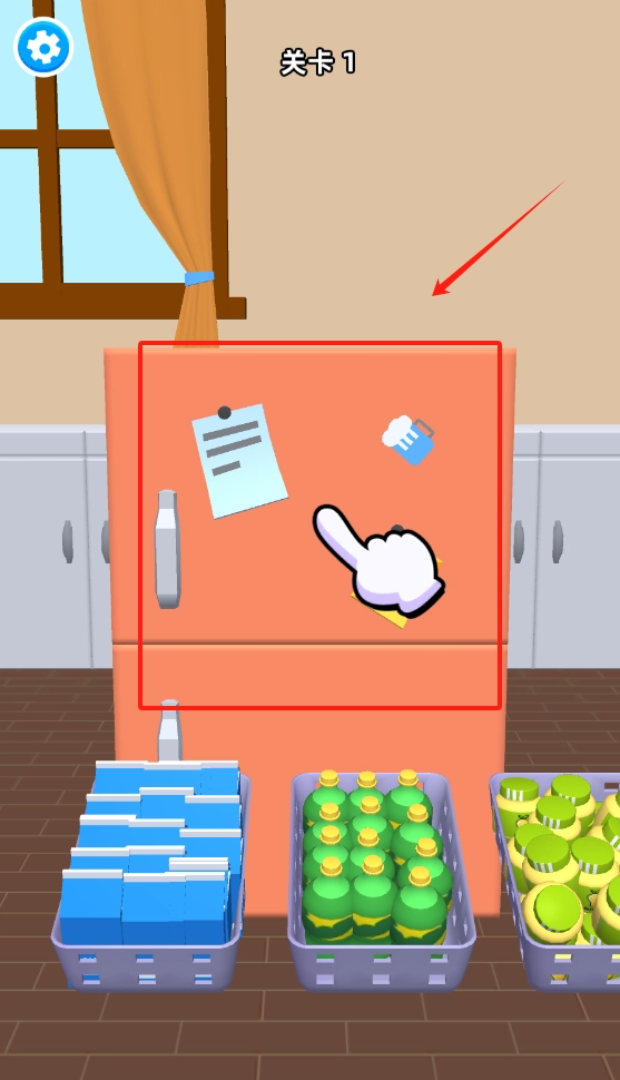 1. 轻点冰箱门上的图标,接着将眼前的三篮饮料拖拽至冰箱之中。