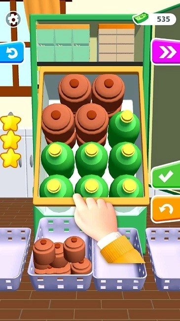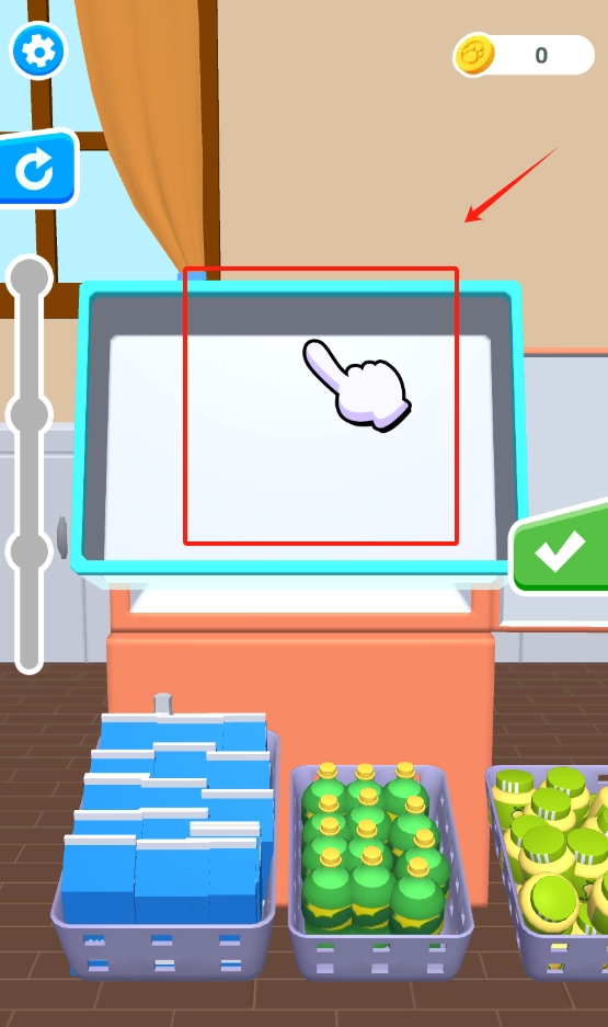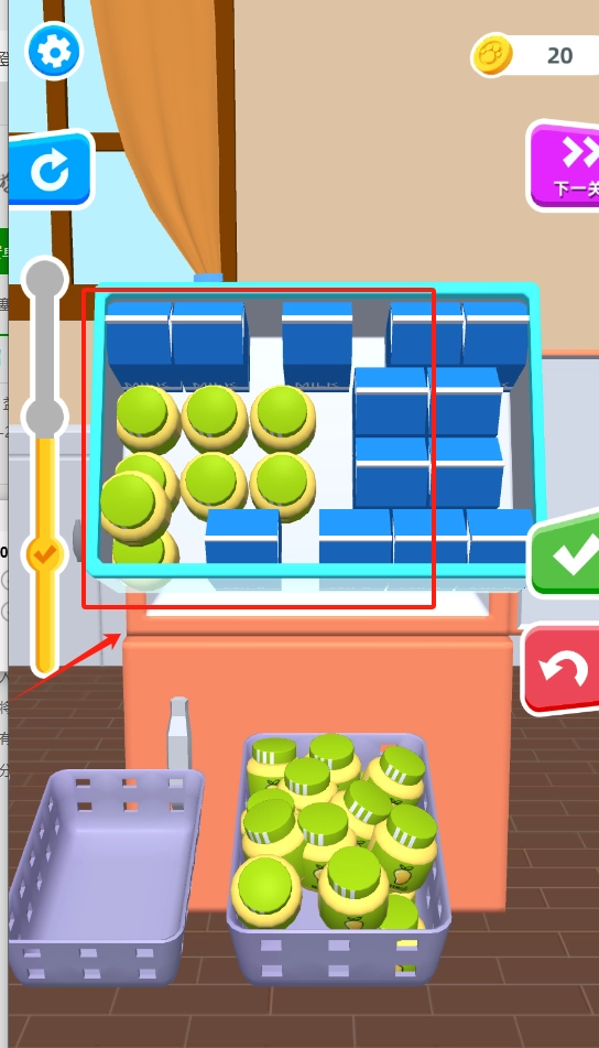3、将右边筐子里绿色盖子、黄色身子的物件,放入冰箱的空余位置,等金币积攒足够后,就能进入下一关。