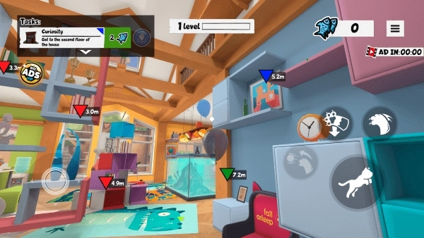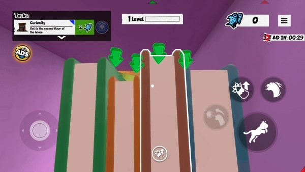 2、在游戏的左下角能够操控猫咪前进或后退,而在右下角则可进行跳跃、挥爪等行为。