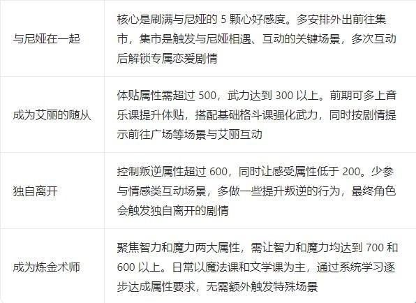 提供音乐、舞蹈、格斗、魔法等多种课程,以及义工、聆歌楼打工等多样打工选项,不同选择会导致不同的结局多。