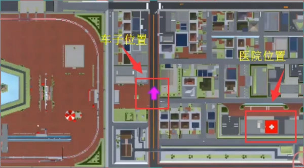 打开地图界面能够查看实时位置,箭头标识代表救护车当前所在位置,十字标记则表示医院目的地。