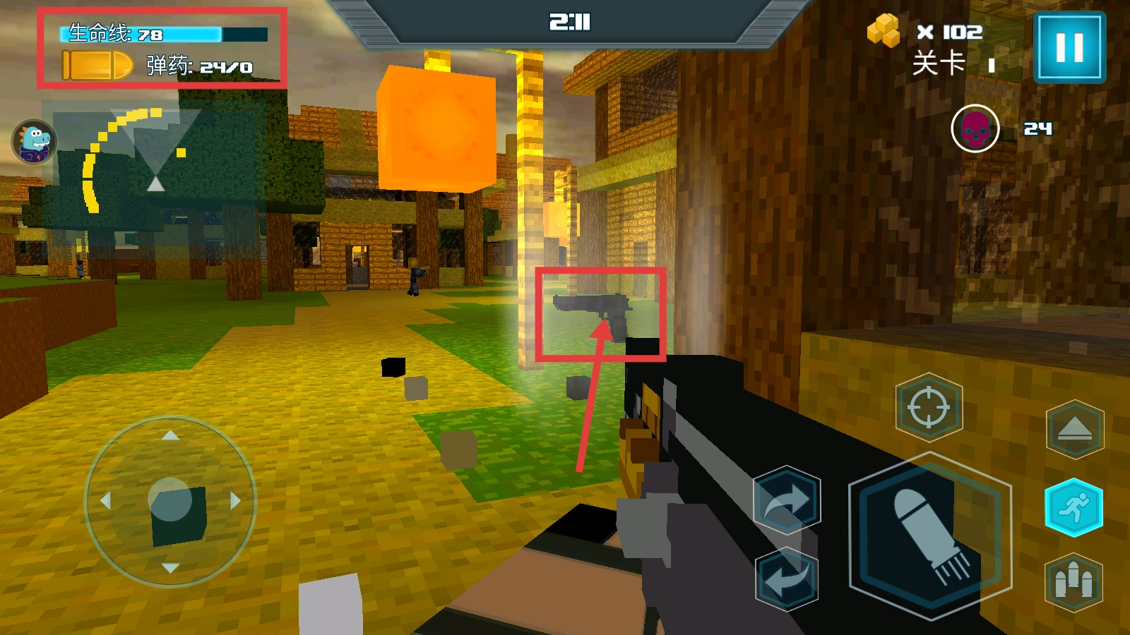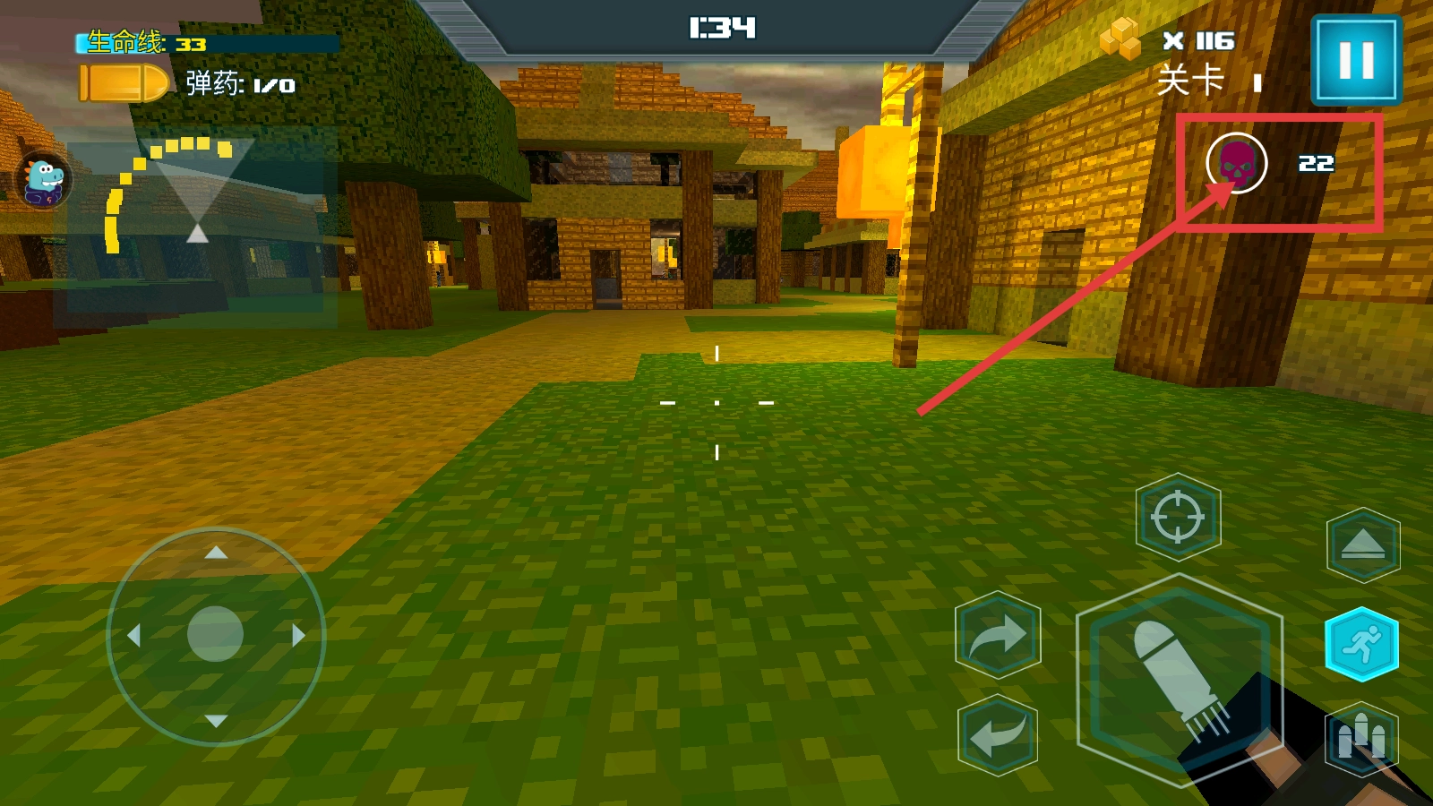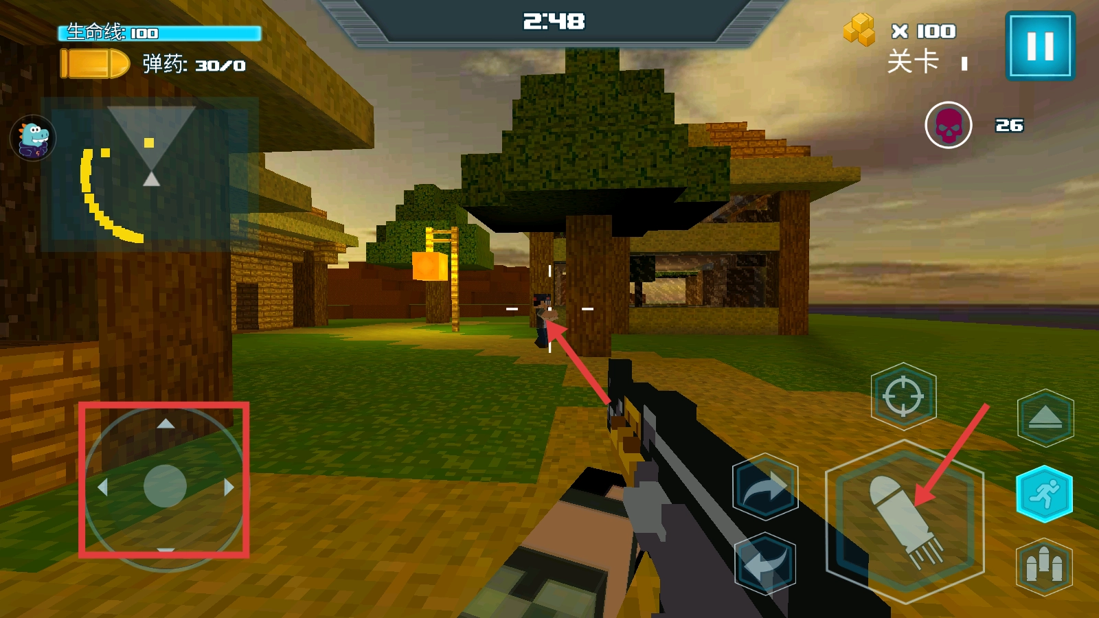 通过移动摇杆来控制角色行动,点击攻击按钮即可向敌人发起射击,同时要留意【生命线-100】与【弹药-30/0】的状态,采取稳健策略逐步推进关卡进程。