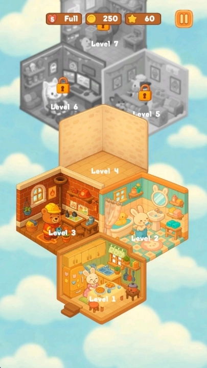 游戏采用渐进式场景解锁机制来维持新鲜感,从最初接触的树屋公寓到后续的水晶宫殿,每个新场景都带来了风格迥异的设计挑战。