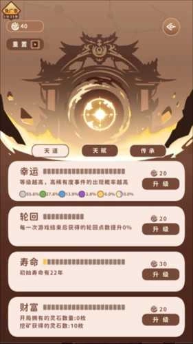 当玩家的寿命消耗殆尽时,这一局游戏便宣告结束,此时玩家能够选择再次进入轮回以开启新的一局,并且每完成一次游戏都能获取点数,这些点数可用于增强自身的天赋,或者解锁各类强力的传承。
