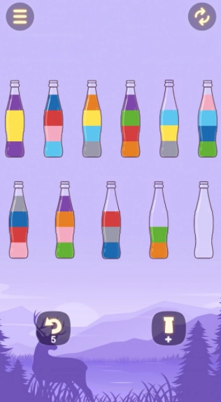 通过颜色分离的方法,把混合液体里的各类色素逐一拆分出来,再重新调整它们的顺序并组合,最终形成满足通关条件的单一颜色液体排列。