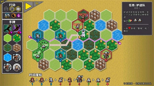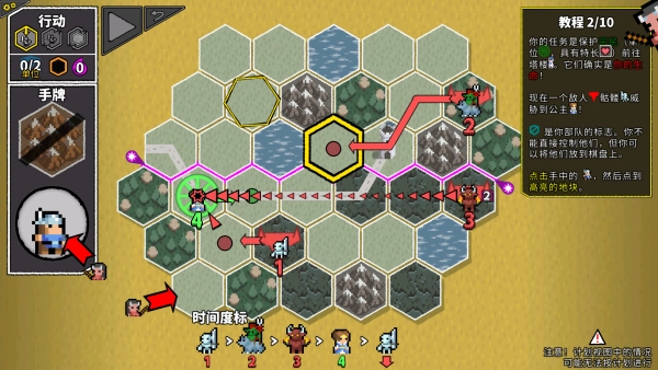 在你放置好卡牌后,点击左上方那个黄色的三角符号,接下来棋盘上的棋子就会依照下方时间度标的顺序自动行动起来。