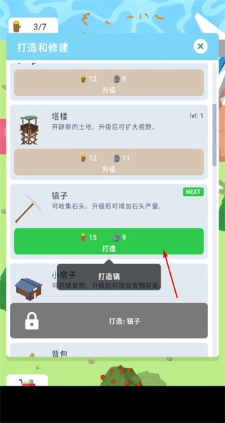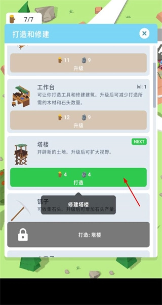 在搭建界面中消耗木材、石头这类资源,建造并升级工作台、塔楼、镐子等各类建筑与设施,以此降低建造所需的资源消耗、拓展观察范围或是提升资源产出量。
