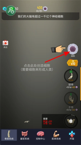 点击细胞图标即可创造细胞,这些细胞是构成人类的基础,这一操作是推动造人进程的关键环节,在创造过程中要留意细胞数量的逐步积累。
