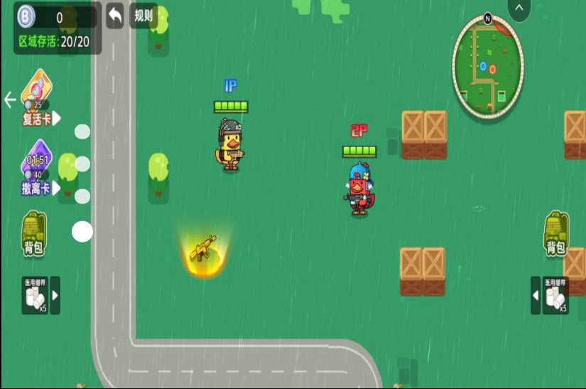 通过虚拟摇杆控制小白鸭在战场中四处移动,探寻地图的各个角落,收集黄金、矿石等多种物资,以此积累资源。