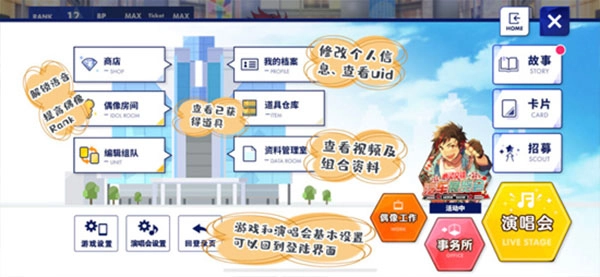 主页偶像菜单(位于左侧):能够对主页偶像的人物形象、服装搭配以及背景进行调整与更换,也可以切换为已获取的偶像相关卡面CG。主界面最多可放置两位小偶像。