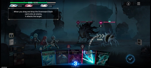 游戏采用卡牌回合制策略战斗模式,玩家需要抽取卡牌来选择敌人发起攻击。