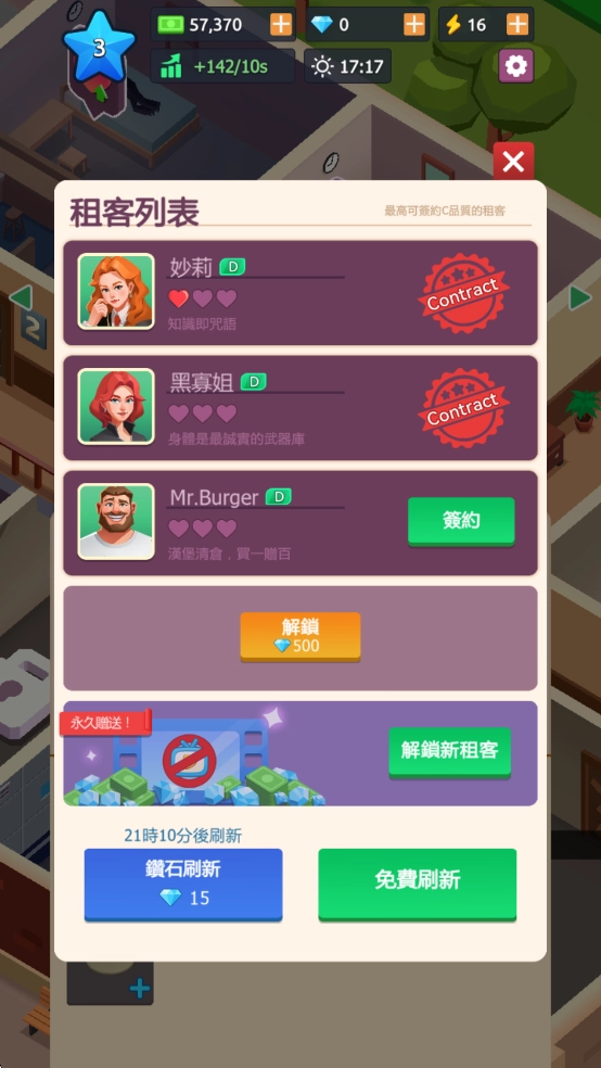 别再把目光局限在市中心啦!随着等级一步步提升,你会解锁越来越多的新区域:有阳光灿烂的海滨度假村,有热闹繁华的都市商业圈,还有宁静雅致的郊区别墅区……每一张新地图都有着独一无二的建筑风格和租户群体,既能带来全新的经营挑战,也能让你获得不一样的视觉享受。继续不断地扩张你的版图吧,让“公寓大亨”的旗帜插满每一片充满生机的土地!