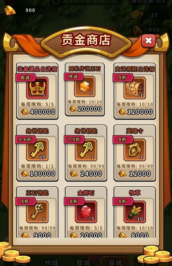产出的贡金能够在贡金商店里兑换英雄令、牧草之类提升战力必备的物资。