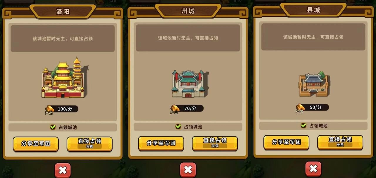占领城池后会产生贡金收益,城池等级越高,贡金的产出量就越大(例如县城每分钟能产出50贡金,州城每分钟产出70贡金,都城每分钟则可产出80贡金等)