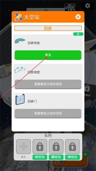 点击建造按钮,太空人便会开始搬运物资,着手进行回廊地板的建造工作。
