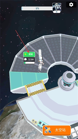在任务地点的进度条处点击提速按钮,就能通过观看视频来助力太空人加快工作节奏。