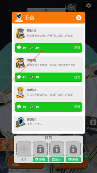 在完成基础设施的建设工作之后,就能够着手进行太空站内设备的建造了,此时点击压制机即可启动建造流程。