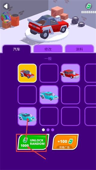 在车库界面中点击“UNLOCKRANDOM1000”按钮,花费1000金钱解锁一辆随机车辆,以此提升战斗属性,为接下来的关卡储备战力支持。