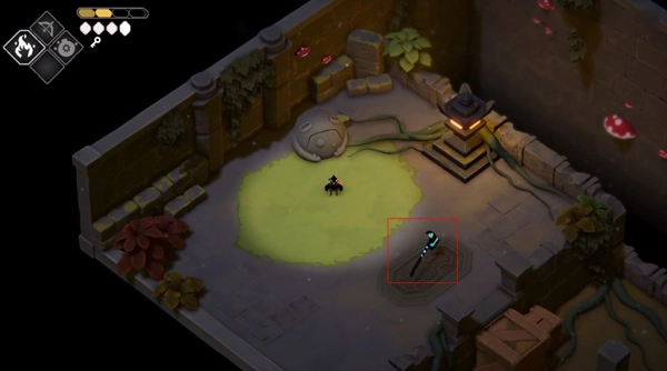 继续朝右行进,抵达十字路口后转向下方,开启初始的存档位置。