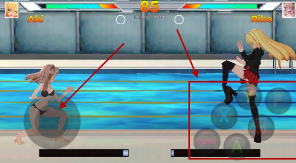 接下来我们就能开启格斗环节了,左边的摇杆可操控角色的移动方向,右边则是各类动作对应的按键。