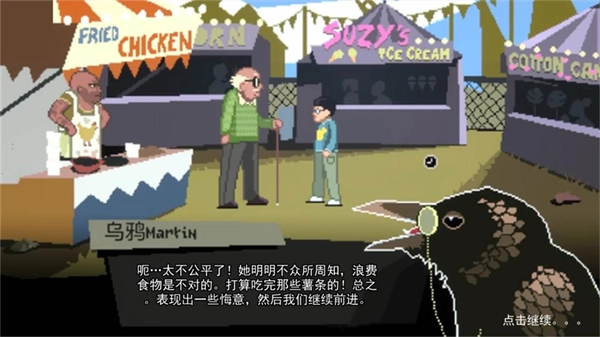 游戏前期存在大段对话,叙述了男孩吃女孩薯条的过程,点击开始。