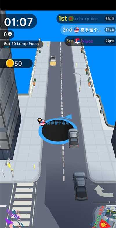 我们需要不断吞噬周围的建筑物、汽车等物品,这样才能让自己的黑洞不断扩大,如果大家想要快速使自己的黑洞长大,我们可以去吞噬比自己弱小的黑洞,不要角色这样的行为不好,有这样想法的玩家可不止你一个,只有这样才能使你的黑洞快速长大。