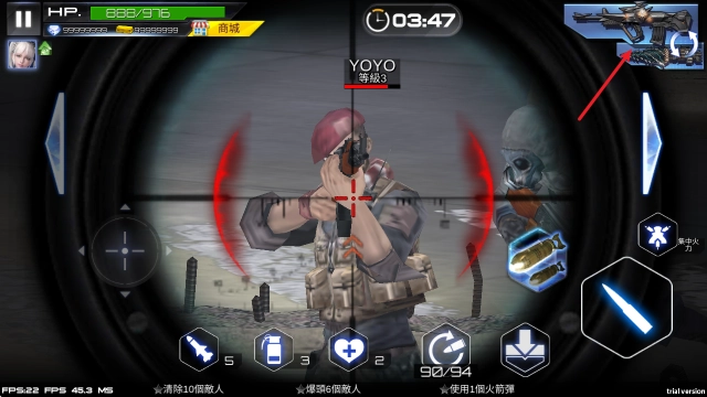 右上角能够切换主副武器,比如在这里就切换成了狙击枪。