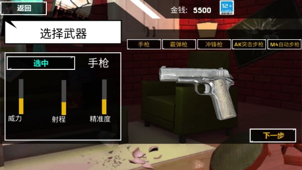 从武器库中挑选适合当前场景的工具,像手枪、霰弹枪这类,选定之后就能在场景里随意破坏,完成任务要求。
